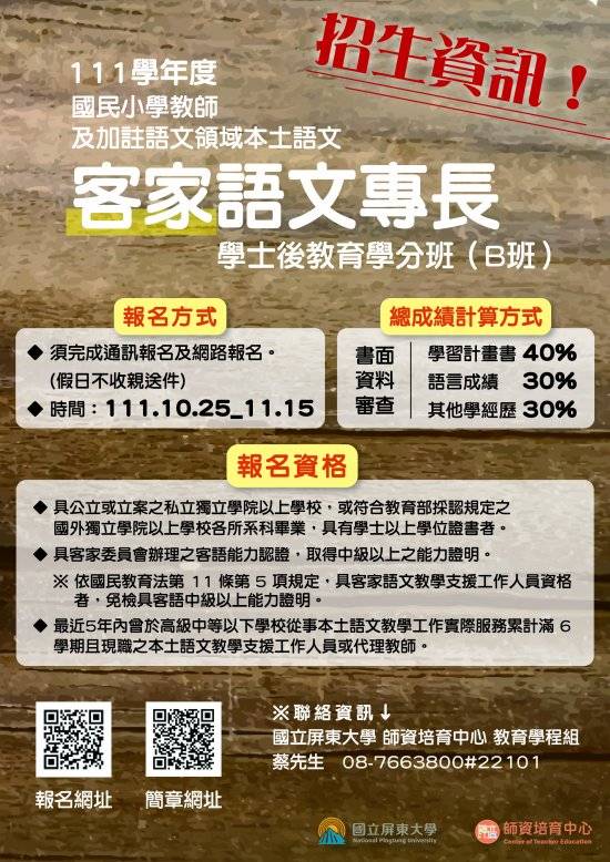 主旨:轉知國立屏東大學辦理 111 學年度「國民小學教師及加註語文領域本土語文客家語文專長學士後教育學分班( B 班)」,請鼓勵符合資格者報名參加,請查照。