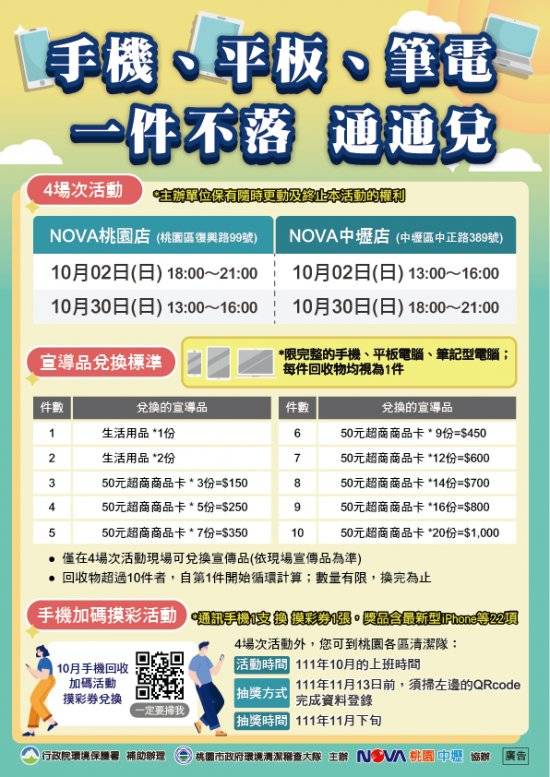 | 三、 | 另本局為配合旨案活動,與 NOVA 資訊廣場合作,辦理回收廢手機可兌換精美好禮加碼活動(詳如附件 2),相關活動時間及地點如下: |