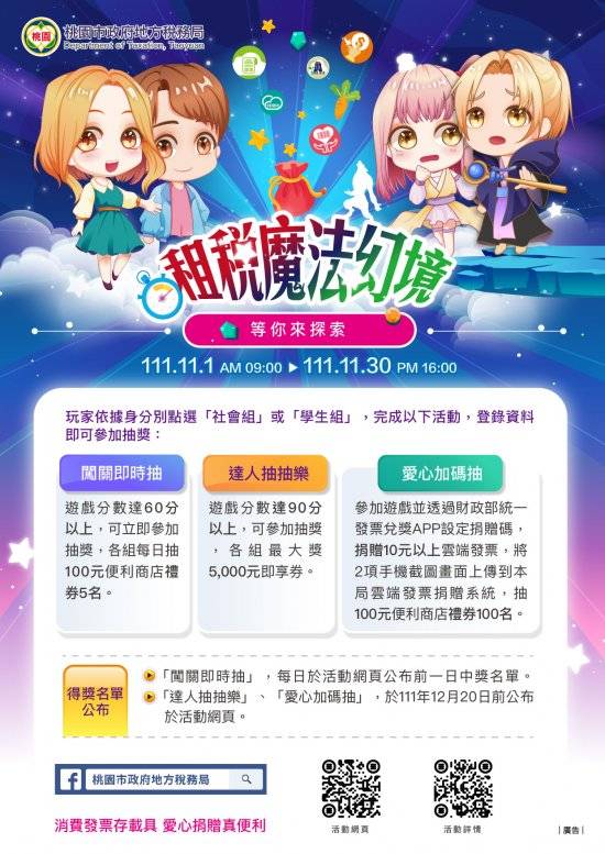 | (三) | 參加遊戲者,可參加「愛心加碼抽」活動,透過財政部統一發票兌獎 APP 設定捐贈碼並捐贈 10 元以上雲端發票,將 2 項手機畫面截圖上傳至本局雲端發票捐贈系統,抽便利商店禮券 100 元,於活動結束後抽出 100 名。 |
