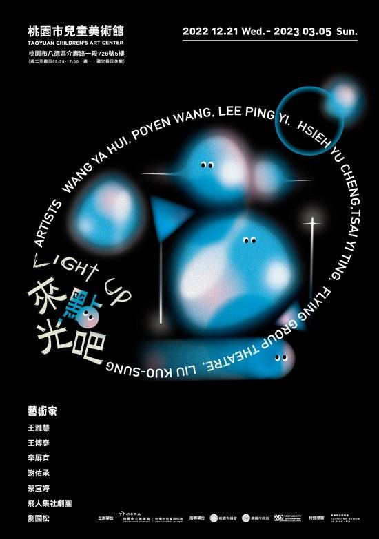 | 一、 | 桃園市兒童美術館策劃「來點光吧」年度特展,展出王雅慧、王博彥、李屏宜、謝佑承、蔡宜婷、飛人集社劇團、劉國松等七組藝術家/團隊的作品,透過錄像、繪畫、互動裝置、劇場等不同當代藝術創作,捕捉光的不同形象與姿態,引導孩童開啟一場以光為主題的思考與漫遊。 |