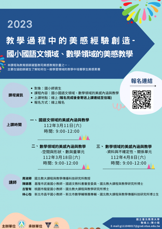 二、教育部師資培育及藝術教育司委託國立臺北教育大學執行中小學師資生美感素養培力課程發展計畫,另本校協助辦理美感教案設計徵選。為讓師資生瞭解如何在學科/領域教學中融入美感素養,特辦理線上研習課程,鼓勵師資生結合學科/領域教學,於國語文、數學(國小)與綜合活動(國中)等上述三個學科/領域融入美感元素,創發具有美感之教學設計,供全國中小學教育人員參考。