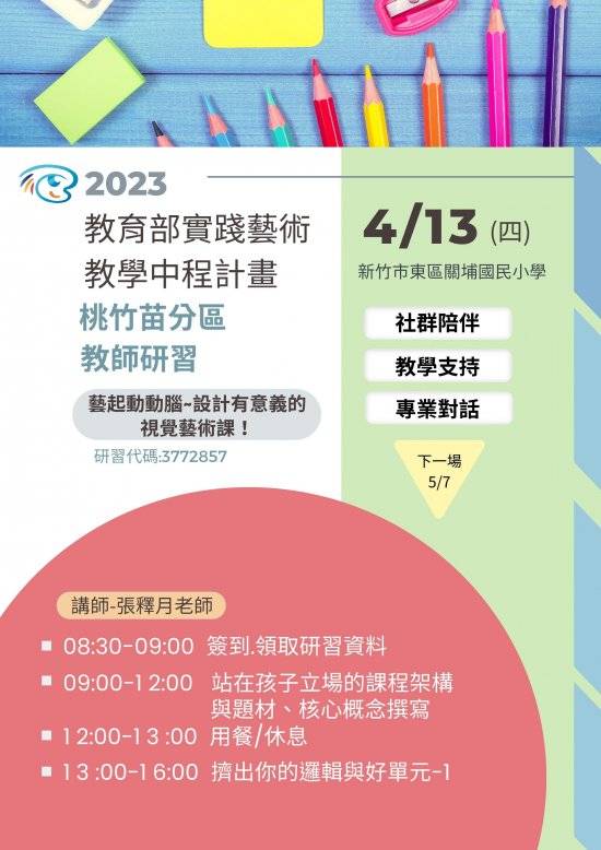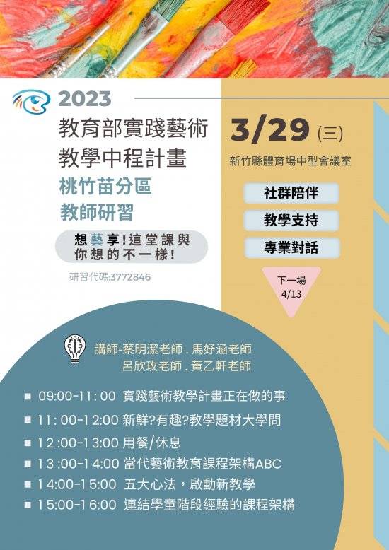 主旨:有關國立屏東大學辦理「教育部實踐藝術教學研究中程計畫」桃竹苗分區說明會及教師增能研習訊息一案,請查照。