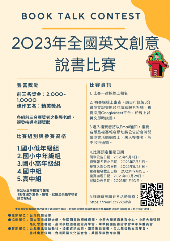 主旨:轉知台灣閱讀協會辦理「2023 全國英文創意說書比賽」一案,請踴躍參與,請查照。