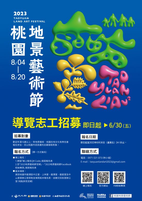 | 三、 | 本案志工招募說明會訂於 112 年 5 月 21 、 22(星期日、一)下午 2 時,假龍潭區老人會館(桃園市龍潭區上林里溝東 120-1 號)辦理,歡迎年滿 16 歲對地景藝術、桃園在地文化有熱忱者報名參加。 |