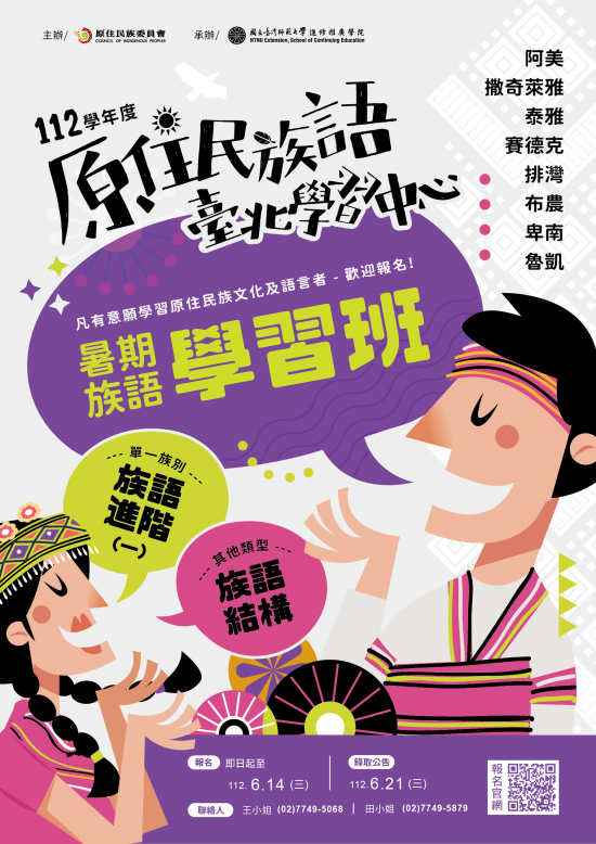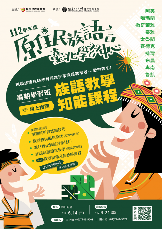主旨:轉知國立臺灣師範大學辦理原住民族語言臺北學習中心 112 學年度暑期「族語學習班」及「教學知能課程學習班」課程資訊一案,詳如說明,請查照。