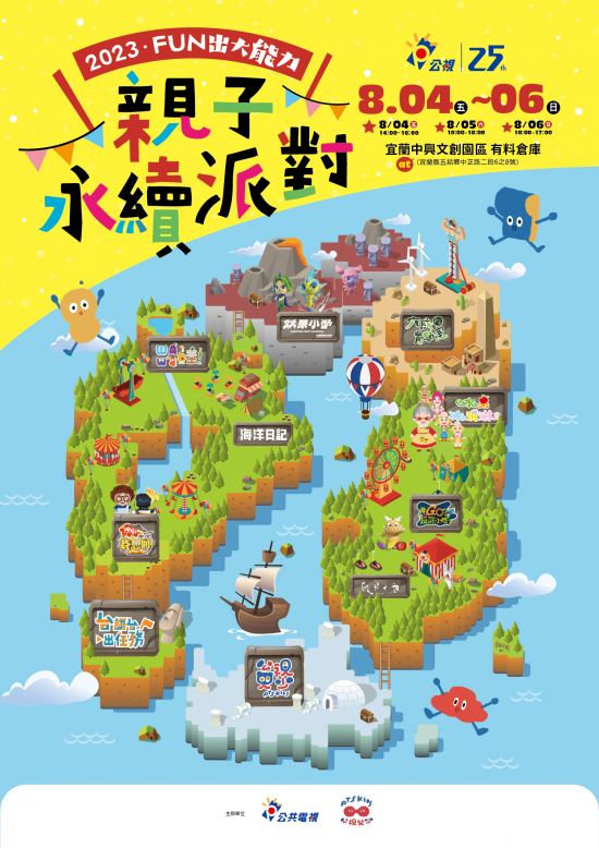 | 一、 | 公視一直努力製播許多優質節目,提供給兒少觀眾族群,希望以寓教於樂的方式陪伴孩子成長!今年繼續推出公視兒少年度活動【FUN 出大能力】親子永續派對, 8/4(五)-8/6(日)三天,在「宜蘭中興文創園區 有料倉庫」(地址:宜蘭縣五結鄉中正路二段 6 之 8 號)舉辦,讓孩子可以從玩樂中學習。 |
