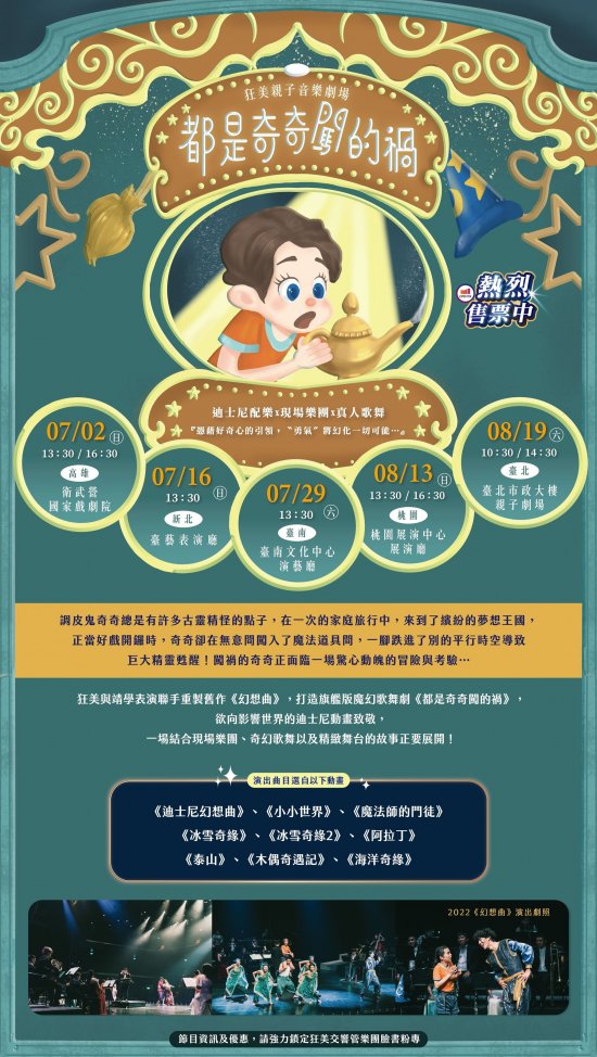 | 一、 | 節目介紹:深受大小觀眾喜愛的狂美交響管樂團,與靖學表演聯手打造旗艦版魔幻歌舞劇《都是奇奇闖的禍》,透過現場真實動人之聲、顛覆想像的故事情節和創意玩轉經典,欲向影響世界的迪士尼動畫致敬,一場結合現場樂團、奇幻歌舞以及精緻舞台的故事正要展開! |