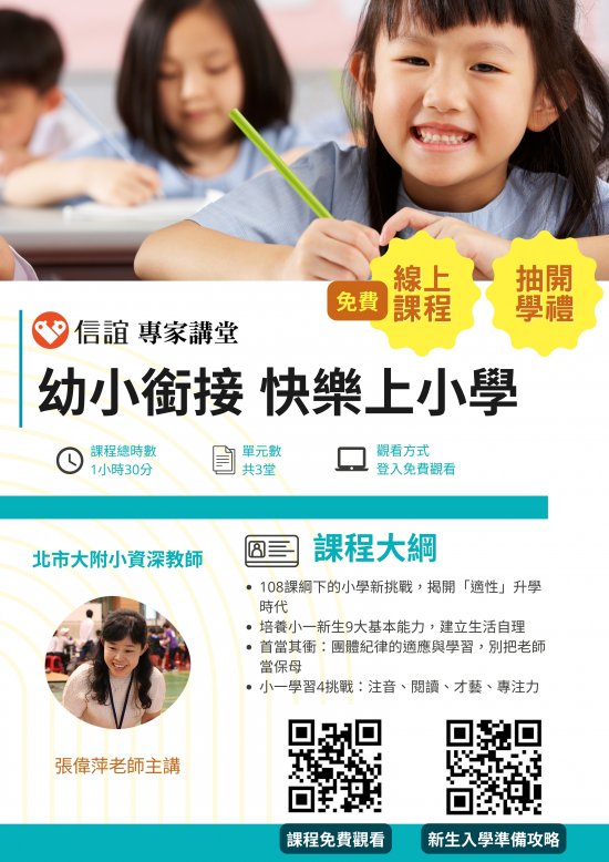 | 三、 | 除線上課程外,信誼也為小一新生企劃「入學準備全攻略」特別專題,從孩子的學習力、生活力及社會力三大預備能力做起,幫助家長陪伴孩子做好入學準備,歡迎參考。專題網址: https://bit.ly/43AOJtE |