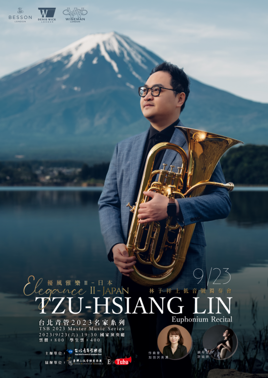 | 一、 | 2023 台北青管名家系列,本次規畫邀請台北青管上低音號首席林子祥老師,攜手鋼琴合作名家許毓婷老師,精選多首日本樂曲與委託創作,呈現日式風格華麗炫技與銅管美聲。 |