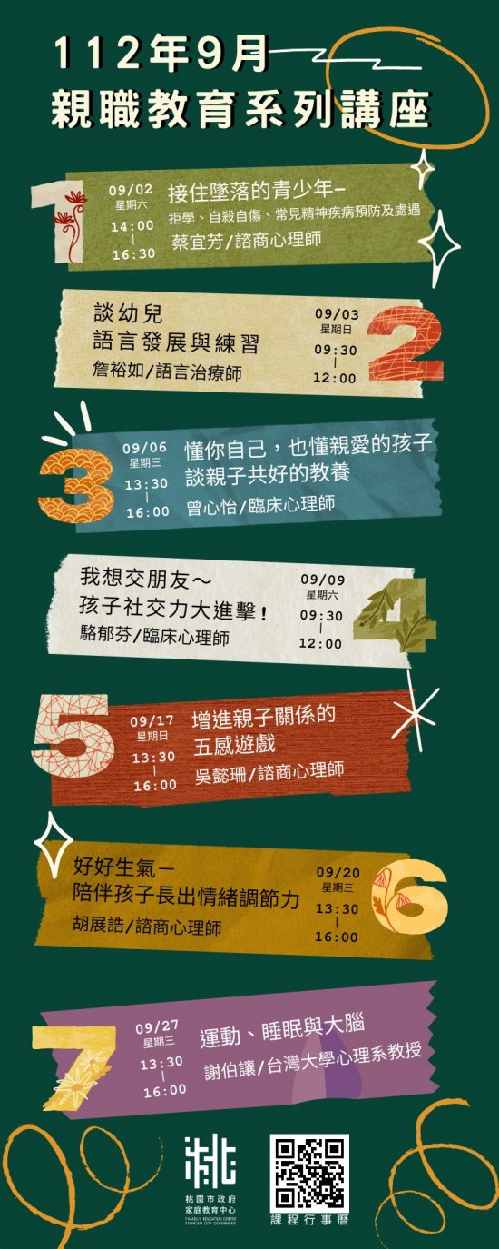 家庭教育中心檢送「小桃家九月課程資訊」、「九月親職教育系列講座」、「教育大未來」、「邁向下一站幸福」海報各1份