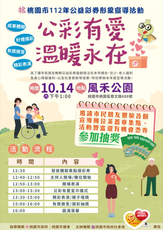 本次活動訂於 112 年 10 月 14 日(星期六)下午 1 時至下午 4 時,假桃園區風禾公園辦理,現場規劃各社福機構及社會團體設攤,透過攤位體驗互動展現公彩成果,活動當天另有精彩表演、親子帶動跳和摸彩活動,歡迎踴躍參加。