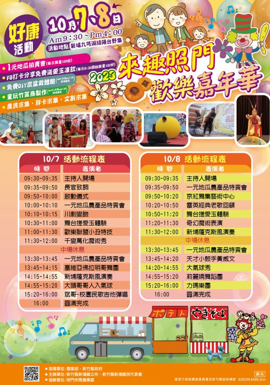 活動內容:童玩 DIY 、文創市集、胖卡市集、一元拍賣會及街頭藝人表演(詳如活動宣傳海報),更多資訊可上「農業易遊網」搜尋「2023 來趣照門歡樂嘉年華」。