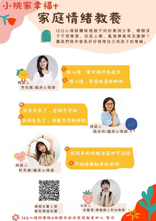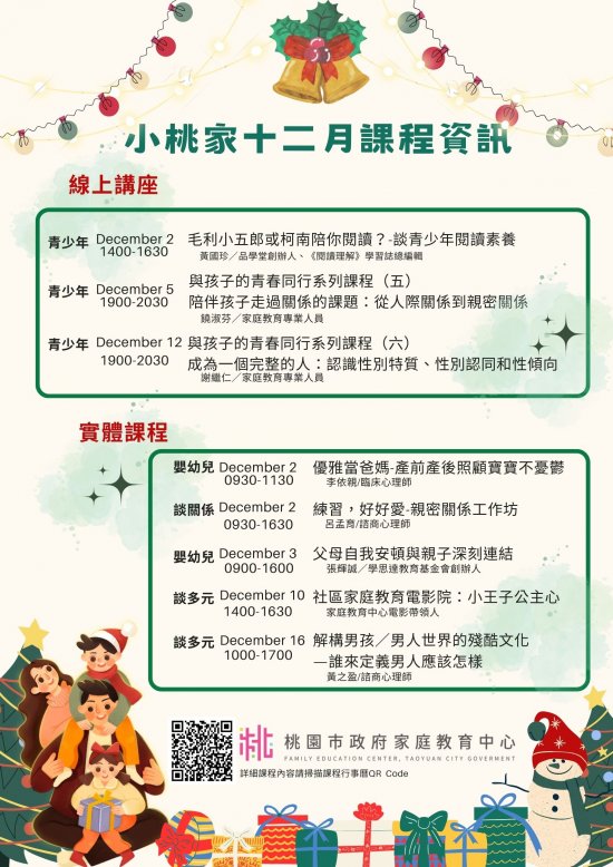 二、 | 旨揭課程詳細資訊,請見中心課程行事曆( https://reurl.cc/xlGyGL )或追蹤「桃園市政府家庭教育中心」FB 粉絲專頁;另倘有家庭教育個別化服務需求,可撥打 4128185 諮詢專線或申請小桃家線上諮詢室( https://reurl.cc/oZWOY5 )服務。 |