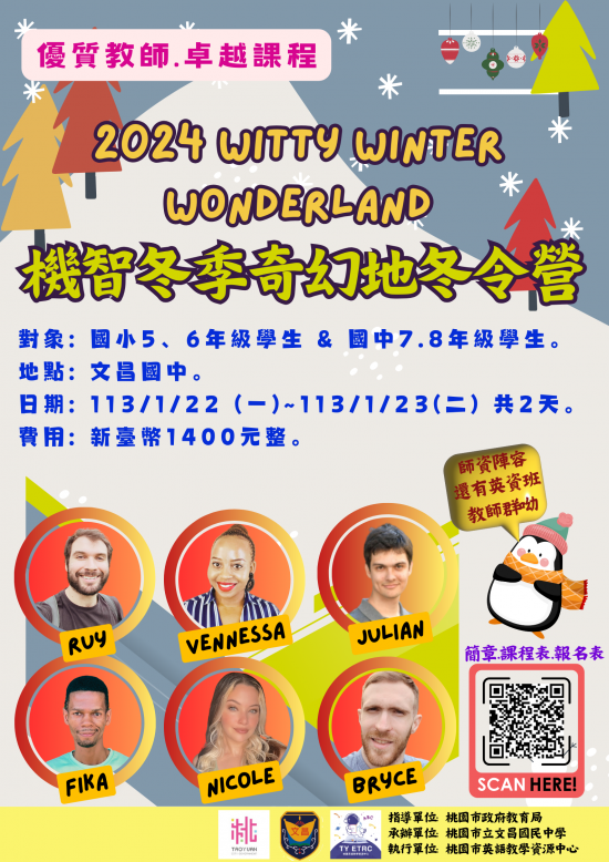 | 二、 | 為提升中小學學生口說展能樂,提供一個充滿學習和樂趣的寒假體驗,特辦理寒假英語營隊,提供學子假期英語學習機會,結合多元領域及豐富課程,包含 SDGs 環境保護、彩繪、球類運動、手工藝及科學手做等課程,幫助學生發展各方面的技能與知識,涵育學子透過豐富課程提升閱讀力、科學力及英語力,探索國際視野深化學習。 |