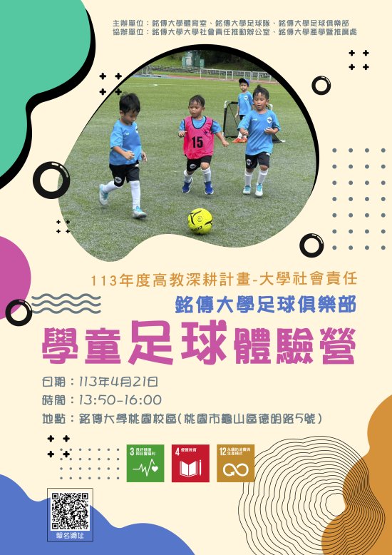 二、本校體育室為善盡大學社會責任(USR)落實在地深耕,奠定基層運動風氣,並藉此達到推展健康社區之目標,擬訂於 113 年 4 月 21 日(星期日)下午 13:50-16:00 辦理免費足球體驗營,邀請桃園市國小及幼兒園學童踴躍參加。