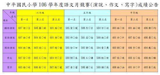 四年級組第一名401許0中、第二名407 張0楨、第三名406詹0兒