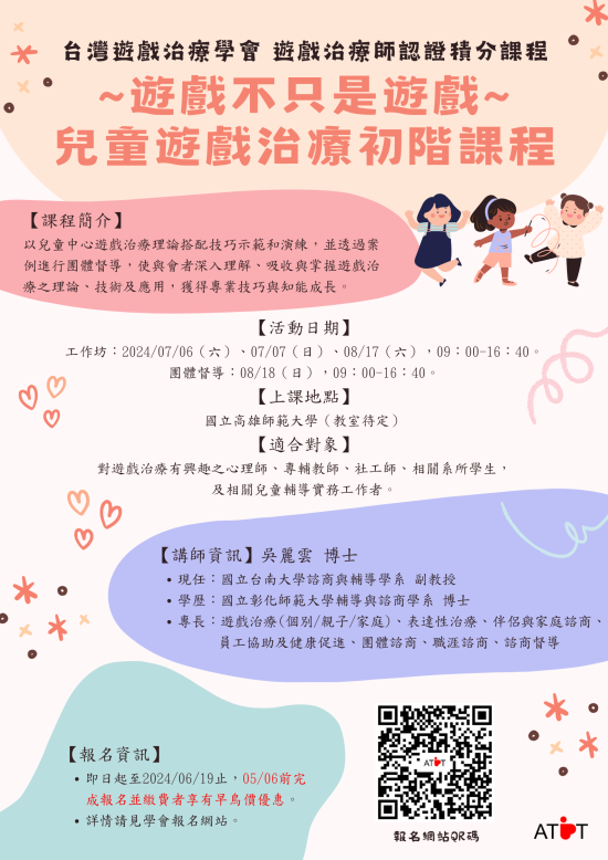 | 一、 | 2024 台灣遊戲治療師認證積分課程『遊戲不只是遊戲』兒童遊戲治療入門課程活動及時間。 |