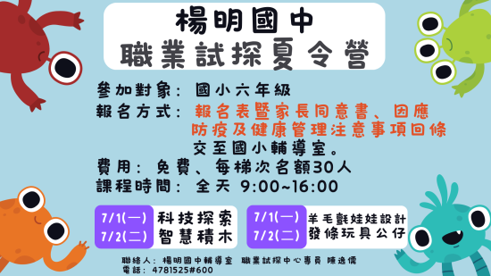 | 五、 | 本課程採全日營隊方式,提供免費午餐,課程內容與學期中課程不同,旨揭計畫、報名表、注意事項回條、報名學生名單(承辦人使用)及宣傳海報如附件。 |
