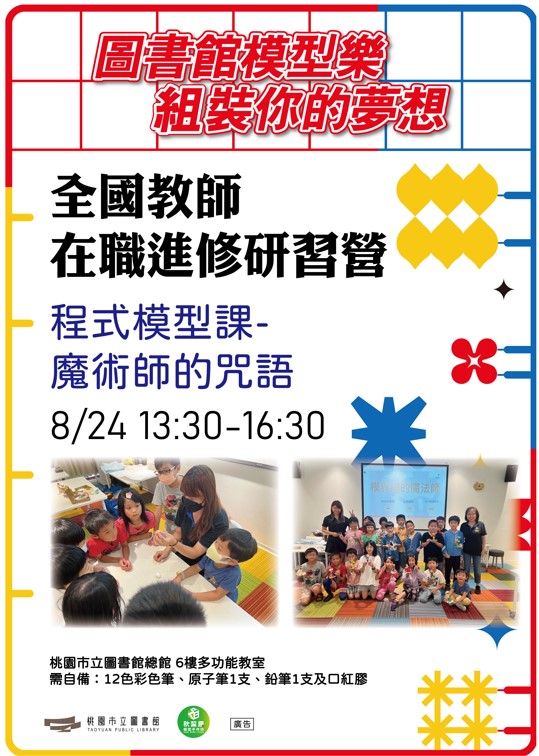 | 三、 | 旨揭研習活動訂於 113 年 8 月 24 日(六)13 時 30 分至 16 時 30 分假桃園市立圖書館總館 6 樓多功能教室辦理,歡迎有興趣的國小老師踴躍參與,每位老師可帶一位 7 至 9 歲小朋友一起體驗,課程免費,名額有限,額滿為止! |