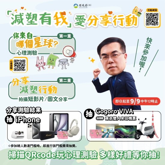 | 二、 | 環境部為鼓勵社會大眾及莘莘學子一起跟上全球減少塑膠的風潮,特辦理「減塑有我」愛分享行動,可透過臉書(Facebook)、 Instagram(IG)等社群媒體,拍攝個人生活中減塑短影片、減塑生活照片,並可透過參加 「你來自哪個星球?」心理測驗遊戲,瞭解並發覺屬於自己獨特的環保行動,歡迎民眾邀請親朋好友一起在生活中響應減塑行動,參加旨揭活動拿大獎。 |