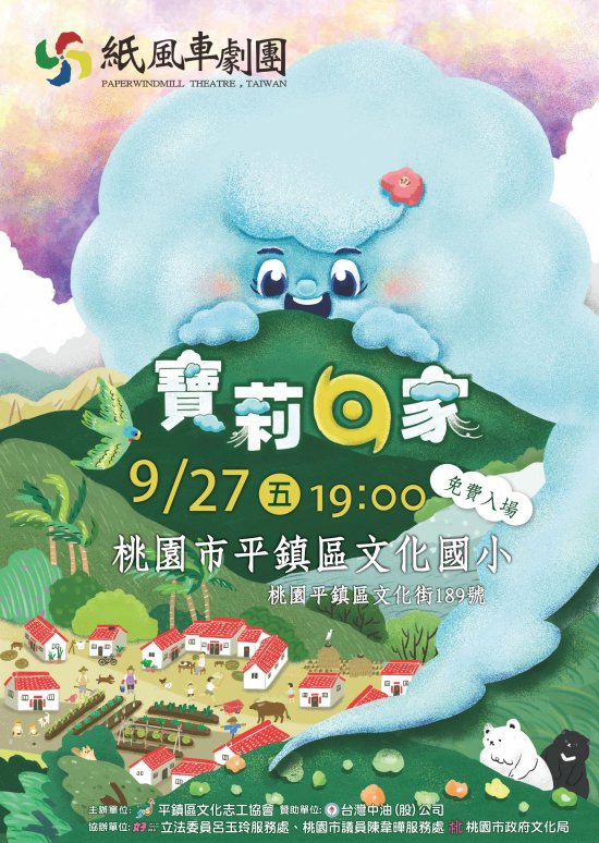 9/27(五)19:00 在文化國小 (桃園市平鎮區文化街 189 號) 有紙風車劇團帶來的新製作親子劇《寶莉回家-桐花島的故事》。 免費的活動 採自由入座 由平鎮區文化志工協會主辦的活動 邀請大家到桃園一起看表演
