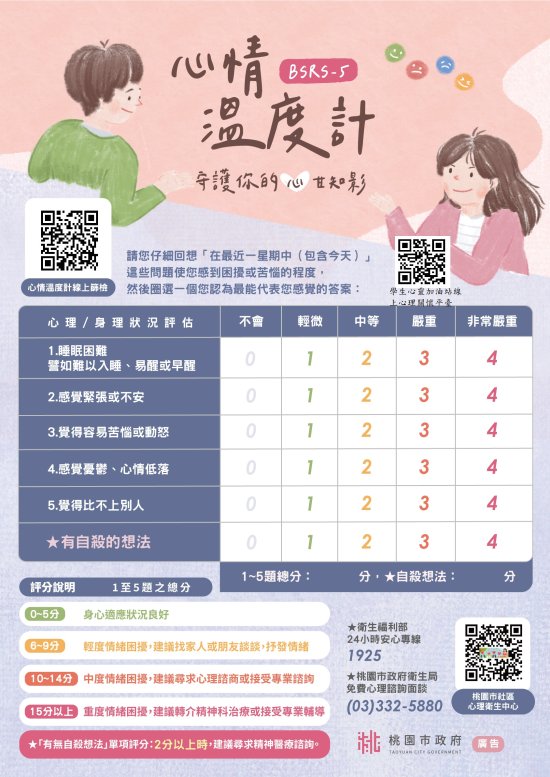| 二、 | 為利本府衛生局針對不同性別、年齡、居住區域等民眾進行其心理健康程度差異之統計分析,請貴校將旨案列入宣導活動或辦理課程時,請教師、學生或民眾使用心情溫度計( BSRS-5 )施測。 |