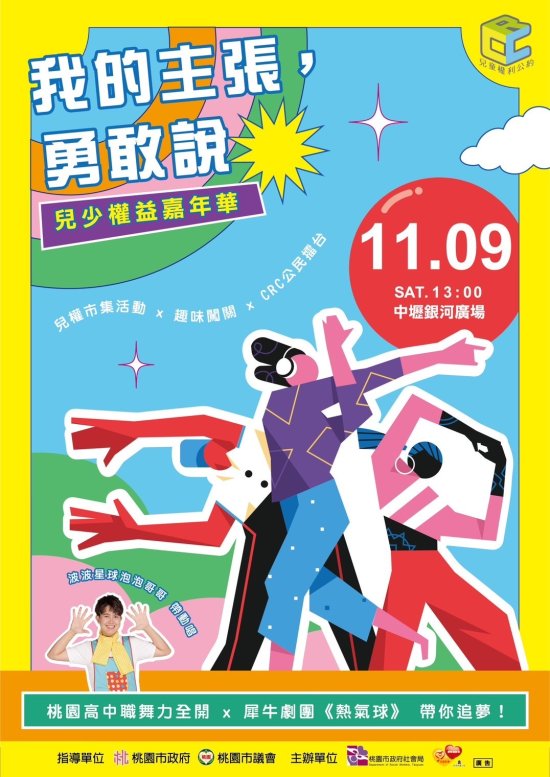 3、 | 活動內容:親子帶動唱、闖關活動、抽獎活動、兒權市集、 CRC 公民擂台、劇團表演及社團表演等多項趣味活動,完成闖關活動準備限量精美小獎品,參加抽獎活動就有機會獲得百元禮券! |