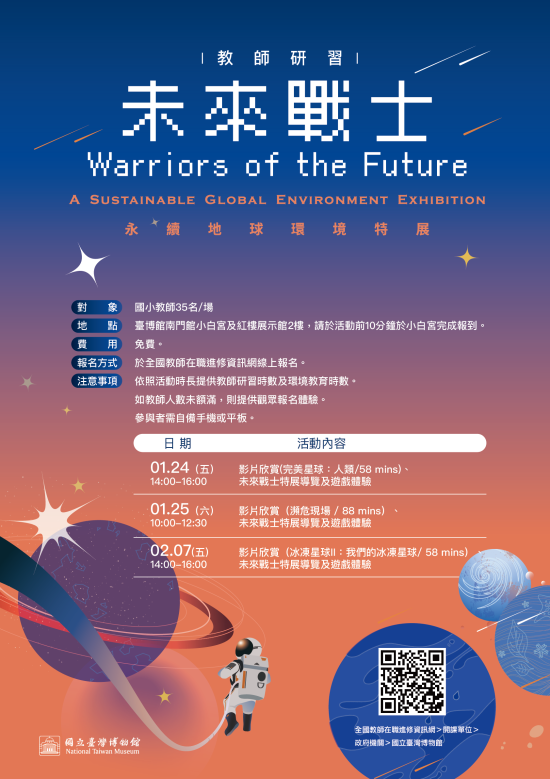 | 三、 | 該館訂於 114 年 1 月 24 日(星期五)、 1 月 25 日(星期六)及 2 月 7 日(星期五)假南門館(臺北市中正區南昌路一段 1 號)辦理三梯次教師研習課程,參與研習之教師,將依課程時長核發研習及環境教育時數。 |