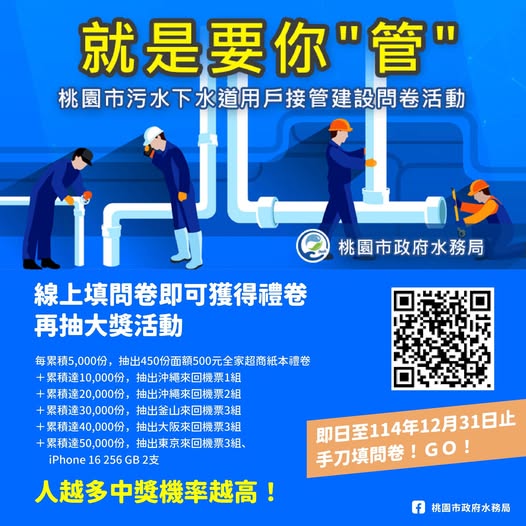| 一、 | 本府積極推動污水下水道建設,為透過民眾的回饋來檢討改進並提供更好的服務品質,爰此本局舉辦「就是要你管」問卷活動。 |