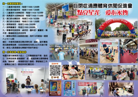 | 二、 | 本會長期致力於自閉症者〈以下簡稱“星兒”〉各項體育〈籃球、桌球、水適能、舞蹈等〉及休閒〈藝術創作、音樂培養、手作工藝等〉等服務,期能提供星兒家庭專屬合適的學習環境,不斷成長〈簡介單張如附件一〉。 |