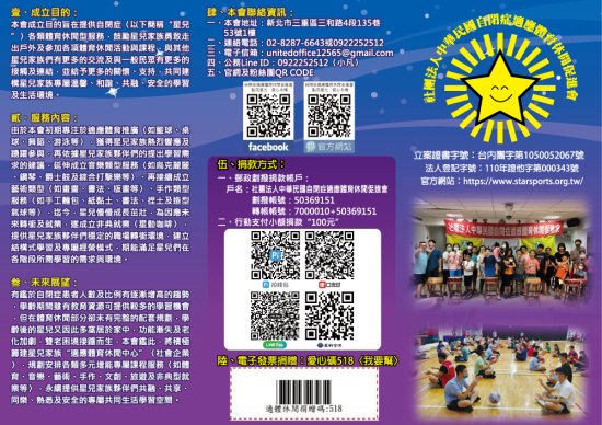 | 五、 | 由於本次活動主旨乃鼓勵星兒家庭走出戶外,增加社會參與及人際互動機會,凡星兒家族參加者均全額免費〈僅收保證金,現場退還〉,並贈送路跑紀念服、毛巾、餐點、闖關獎品及抽獎獎品等,此等均賴社會大眾支持,凡有意捐贈或贊助者,捐款帳戶如下: |