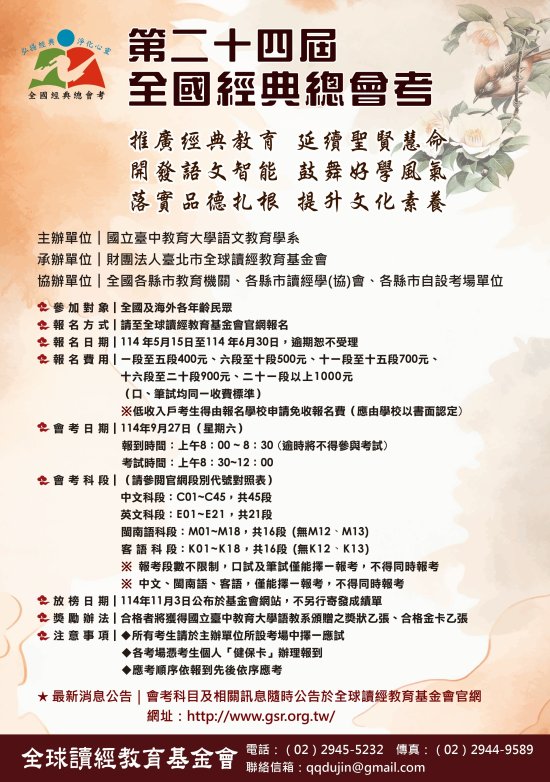 財團法人臺北市全球讀經教育基金會辦理「第24屆全國經典總會考海報」1份