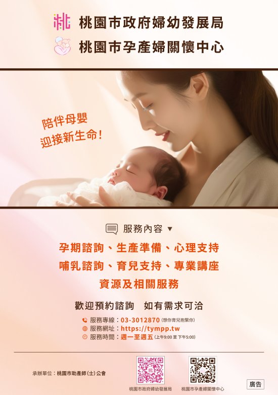 | 三、 | 本案相關宣導海報業已公告於本府婦幼發展局網站(網址: https://dowcd.tycg.gov.tw/),請逕由「首頁>業務服務資訊>健康管理服務>孕產婦健康專區>孕產婦全方位守護」下載使用。 |