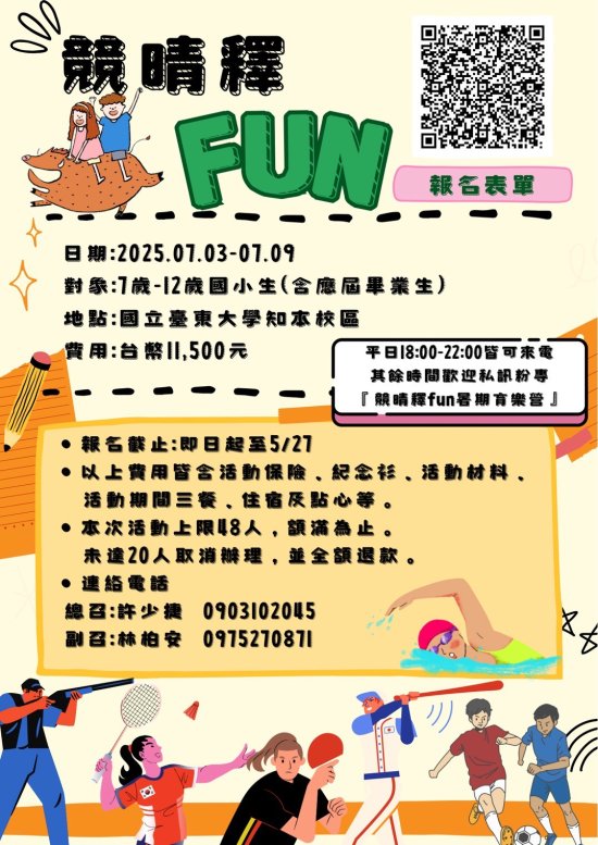 立臺東大學競技與運動科學學系辦理「競晴釋FUN 拼盡全力!選手們的奇幻冒險」暑假營隊活動宣傳報名資料