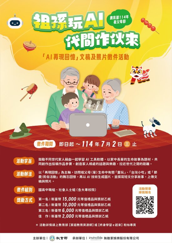 二、 | 為促進代間互動,鼓勵不同世代家人藉由一起學習 AI 工具軟體,以家中長輩的生命故事為題材,共同創作出投稿作品參賽,創造家人相處的話題與樂趣,拉近世代之間的距離,爰辦理旨揭徵件活動。 |