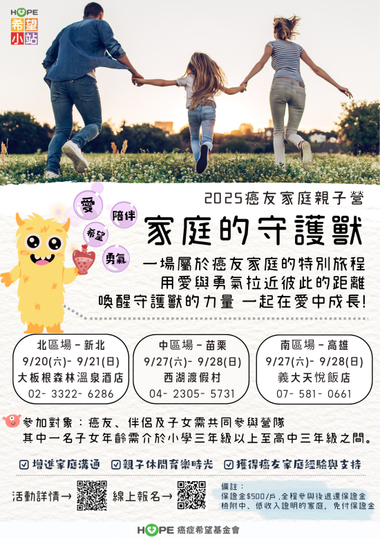 | 三、 | 對象:確診罹癌病人、伴侶及其子女須共同參加營隊,且其中一名子女年齡介於國小三年級至高中三年級。 |