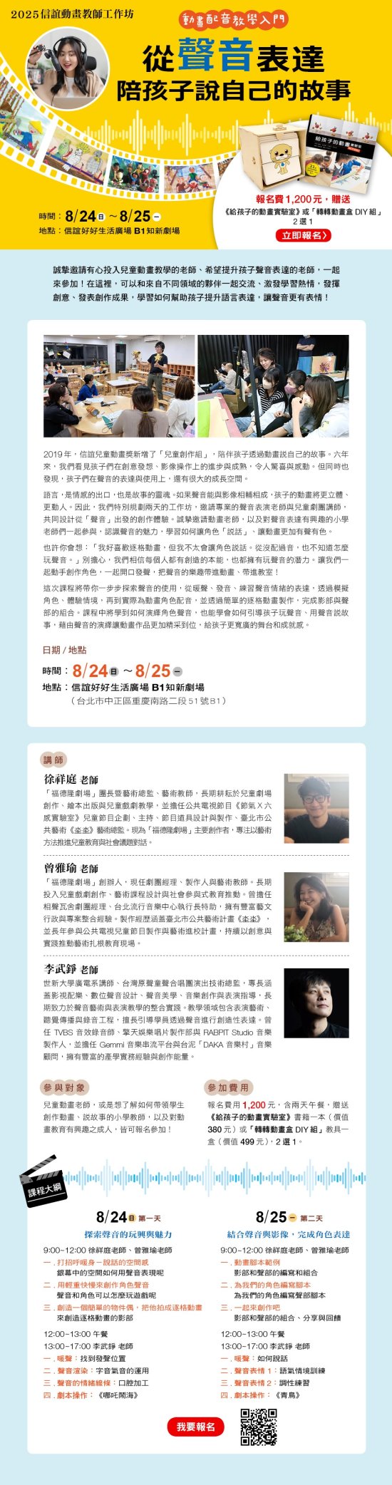 | 二、 | 本次工作坊以「動畫配音教學入門」為主題,聚焦於聲音表達與動畫創作的結合,邀請具備劇場、配音、聲音藝術背景之專業師資,設計兩日豐富課程,協助教師探索聲音表演的教學可能。 |