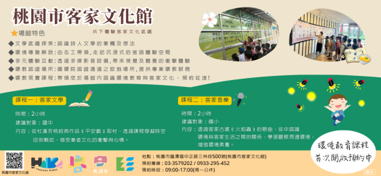 本局所轄桃園市客家文化館兼具客家文化展示與環境教育功能,為環境教育設施場所之一。透過多元展演、親子互動及文化體驗等方式推廣客家文化與環境教育。