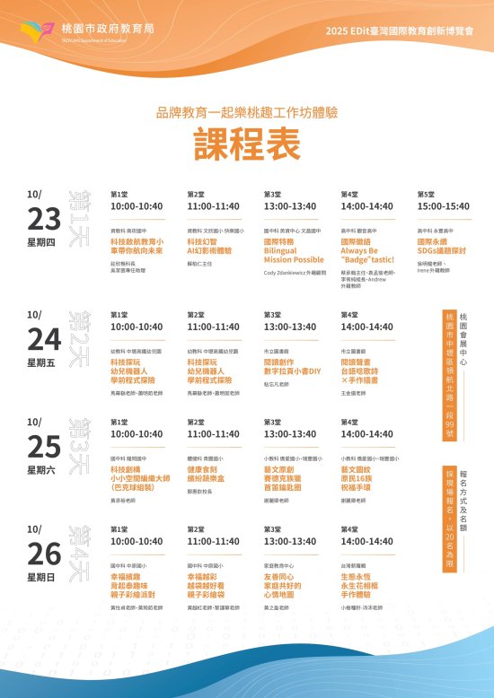 | 五、 | 為期 4 天之活動期間,本局於桃園館規劃「品牌教育一起樂桃趣工作坊體驗」系列課程(以現場報名 20 名為限),內容結合桃園市教育特色與創新教學實踐,歡迎師生、家長及教育夥伴踴躍參與體驗,深入認識桃園品牌教育的多元樣貌與創新內涵。 |
