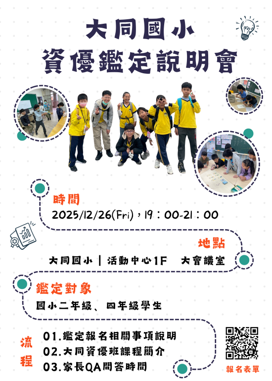 | (三) | 內容:國小資優鑑定報名事項說明、大同國小一般智能資優班課程介紹。 |
