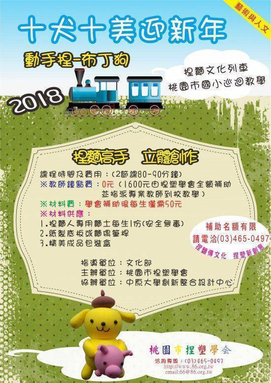 一、本會為推廣捏麵人傳統文化技藝、充實藝術與人文課程內涵,執行「2018 年捏麵文化列車─桃園市國小巡迴教學」計畫,提供專業師資到校教學服務,教師鐘點費用由捏塑學會全額補助。