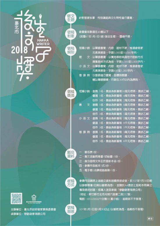 公文轉達--臺北市政府客家事務委員會辦理「2018後生文學獎」