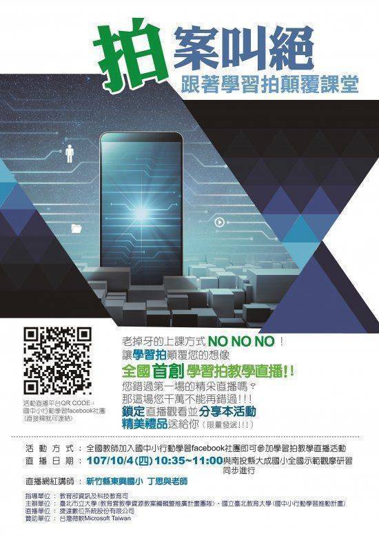 (二)活動方式:加入國中小行動學習 facebook 社團(https://www.facebook.com/groups/Mlearning123/)即可參加學習拍教學直播活動,詳細活動資訊請參見教學直播活動海報。
