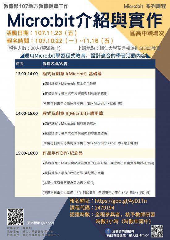 主旨:轉知輔仁大學師資培育中心舉辦「創造教育教師實作工作坊-Micro: bit 介紹與實作」,敬請協助轉知有興趣之教師報名參加,請查照。