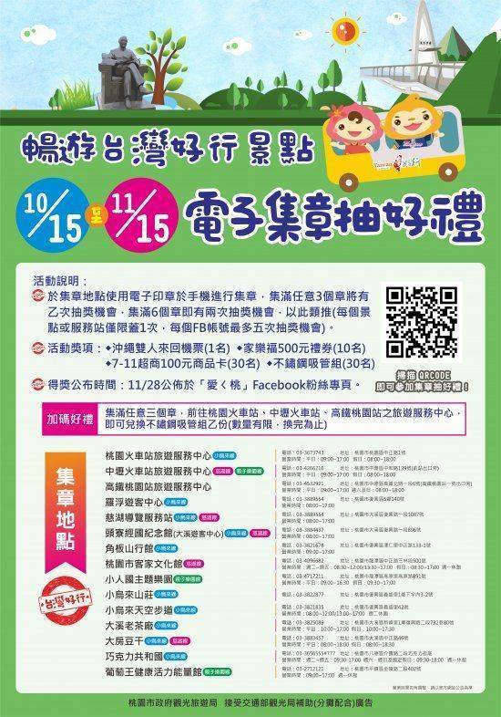 說明: 一、為推廣桃園「台灣好行」,本局規劃於即日起至 107 年 11 月 15 日辦理「電子集章抽好禮」活動,邀民眾搭乘台灣好行小烏來線、慈湖線、親子樂園線,來趟桃園在地特色小旅行之餘,也透過手機進行電子集章抽好禮,獎品豐富,包含:沖繩雙人來回機票、家樂福 500 元禮券、 7-11 超商 100 元商品卡、精美環保吸管組多項大獎,請協助轉知所屬單位、同仁、學生踴躍參加以廣收宣傳效益。 二、檢送活動海報電子檔 1 份供運用。