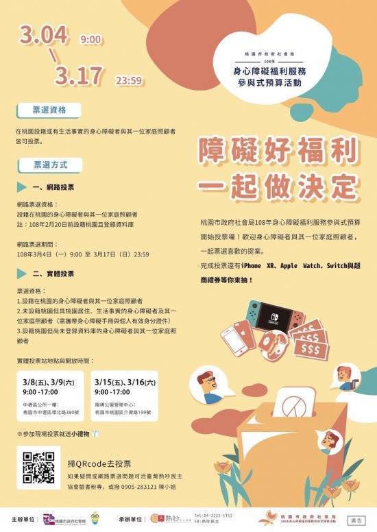 來投票,抽大獎!桃園市政府社會局身心障礙參與式預算開始投票!歡迎身心障礙者與其一名家庭照顧者,來票選喜歡的提案,完成投票還可以抽iPhone、Apple Watch、Switch與超商禮券!上網Key關鍵字:障礙好福利 一起做決定。