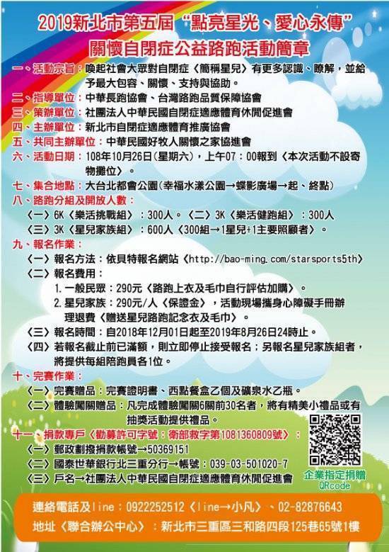| 檢送本會策辦 2019 年第五屆“點亮星光、愛心永傳”關懷自閉症公益路跑 DM 乙份,詳如附件,懇請協助轉知貴校教職員生及自閉症孩童家長們知悉,鼓勵踴躍報名參加! |