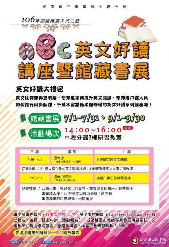 主旨:轉知桃園市立圖書館中壢分館辦理「英文好讀」系列講座,請各校教師踴躍參加,請查照。