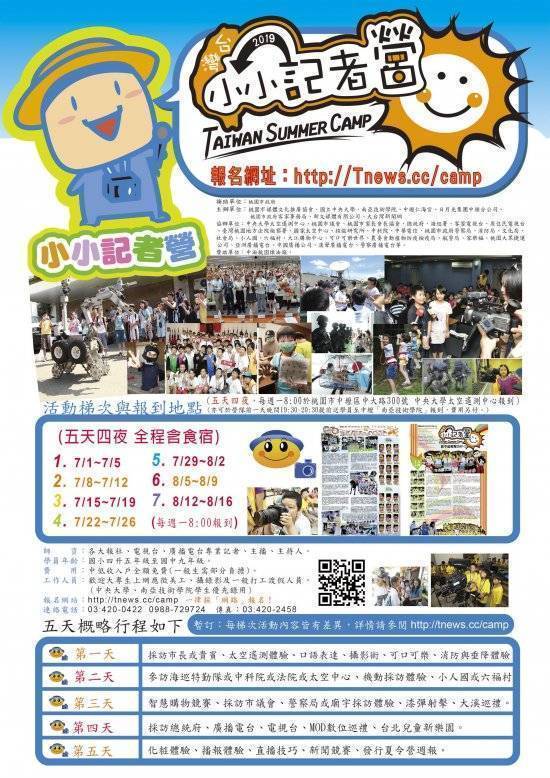 一、本局 108 年 5 月 3 日桃教資字第 1080037779 號函計達。 二、旨揭活動藉由營隊訓練增進學童寫作能力、表達能力與人際互動能力,以培育公民小記者,各梯次辦理期程訂於 108 年 7 月 1 日至同年 8 月 16 日,提供中低收入戶學生免費參加,請惠予協助推薦。 三、本案相關訊息請逕至活動網址( http://tnews.cc/camp/)查詢,或洽該會電話: 03-4200422 。 四、檢送活動文宣 1 份。
