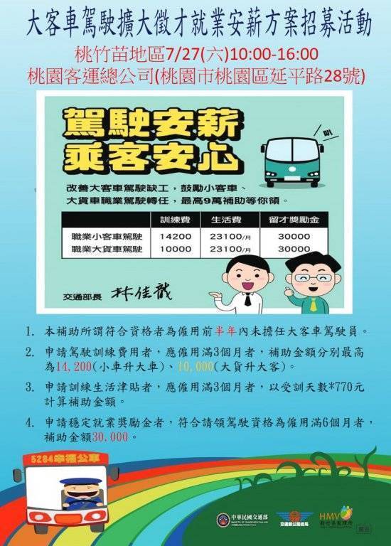 三、為促進客運業者與大客車駕駛能順利媒合,該所將於 108 年 7 月 27 日(星期六)上午 10 時至下午 4 時,假桃園客運總公司(桃園市桃園區延平路 28 號)辦理「大客車駕駛擴大徵才招募活動」,請惠予協助宣導求職民眾踴躍參加。